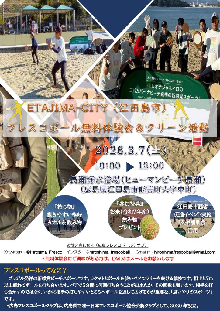「広島フレスコボールクラブ」が、長瀬海水浴場(広島県江田島市能美町大字中町)で『広島湾さとうみネットワークプロジェクト』としてビーチクリーンおよびフレスコボールの体験会を開催します。年齢不問、参加費無料。