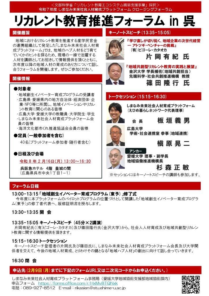しまなみ未来社会人材育成プラットフォーム リカレント教育推進フォーラム ㏌ 呉(2/16開催、2/9締切・広島)