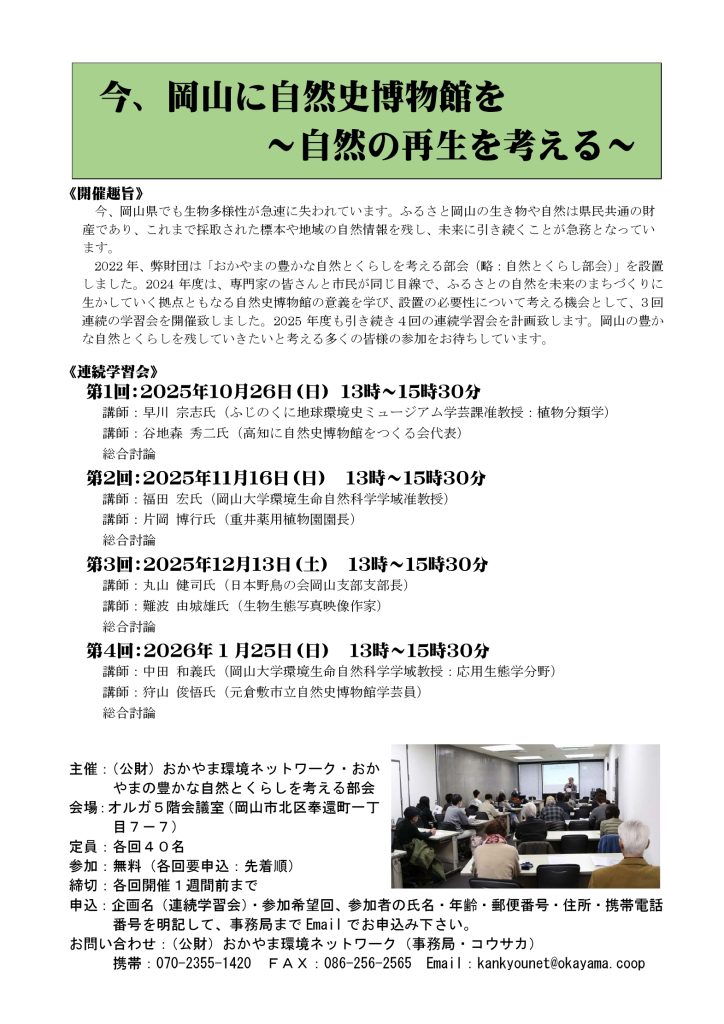 2022年、弊財団は「おかやまの豊かな自然とくらしを考える部会(略:自然とくらし部会)」を設置しました。2024年度は、専門家の皆さんと市民が同じ目線で、ふるさとの自然を未来のまちづくりに生かしていく拠点ともなる自然史博物館の意義を学び、設置の必要性について考える機会として、3回連続の学習会を開催しました。
