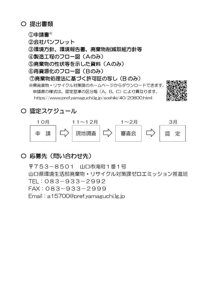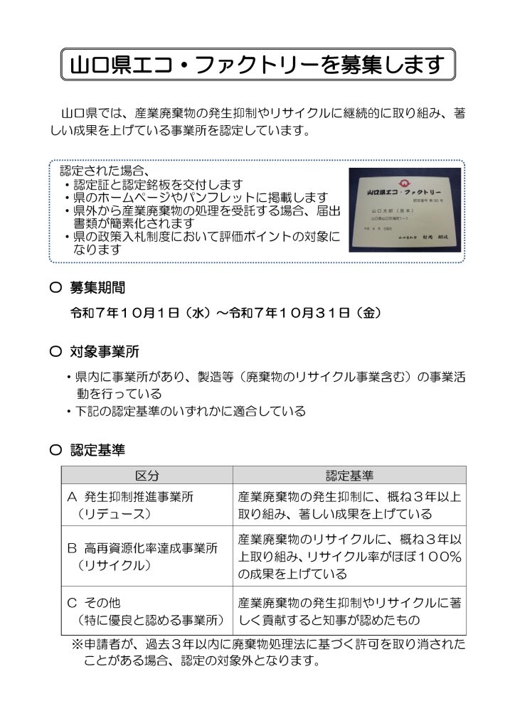次のとおり、山口県エコ・ファクトリーの募集を行います。