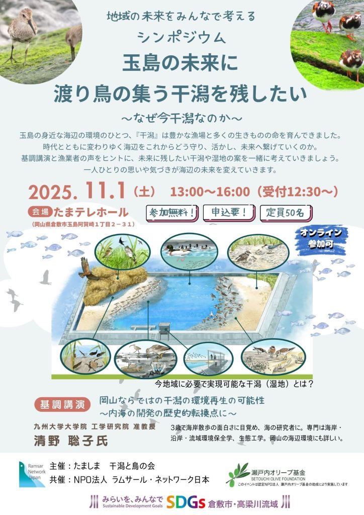 地域の環境をみんなで考える シンポジウム 玉島の未来に渡り鳥の集う干潟を残したい~なぜ今干潟なのか~(11/1開催・岡山+オンライン)