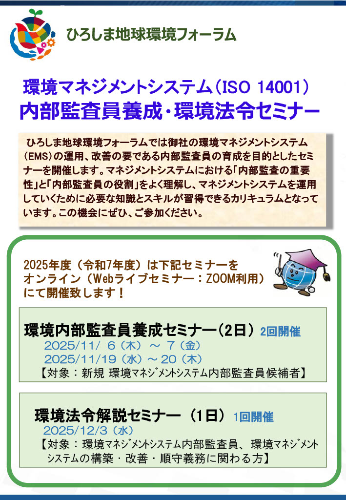 ひろしま地球環境フォーラムでは、事業者の環境管理への取り組みを促進するため、環境マネジメントシステム(ISO 14001)内部監査員セミナーを開催します。
