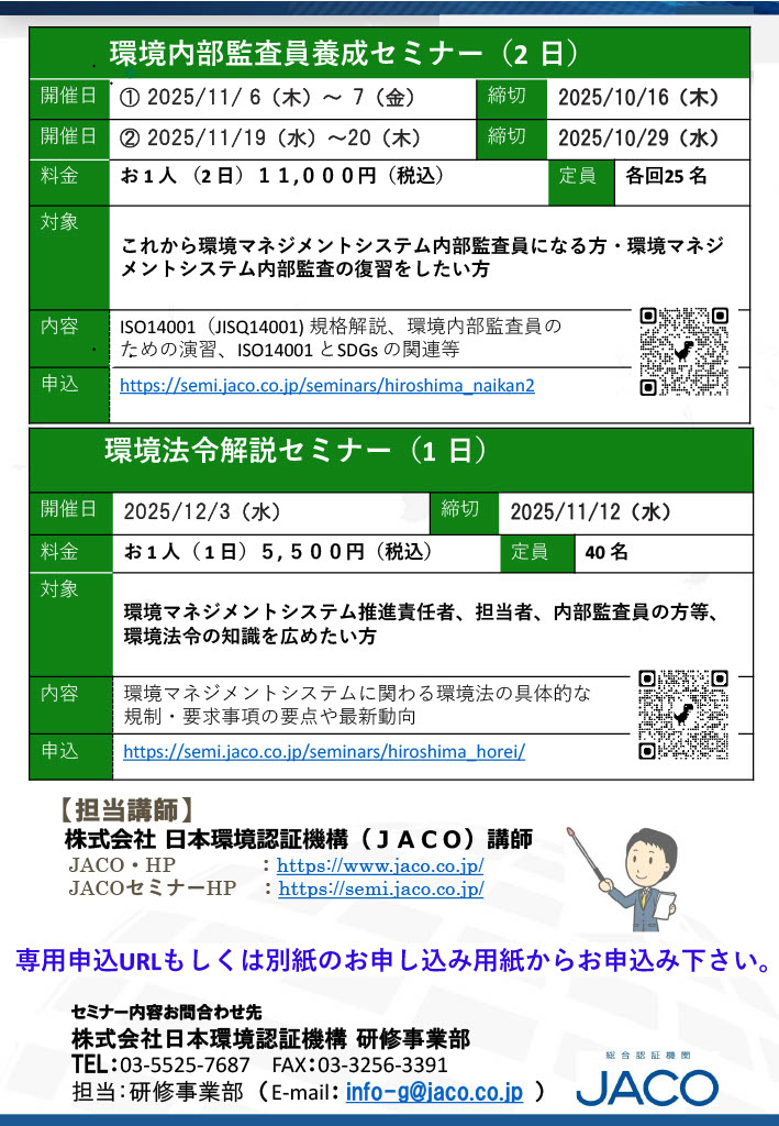 環境内部監査員養成セミナー(11/6-7開催、10/16締切・オンライン)