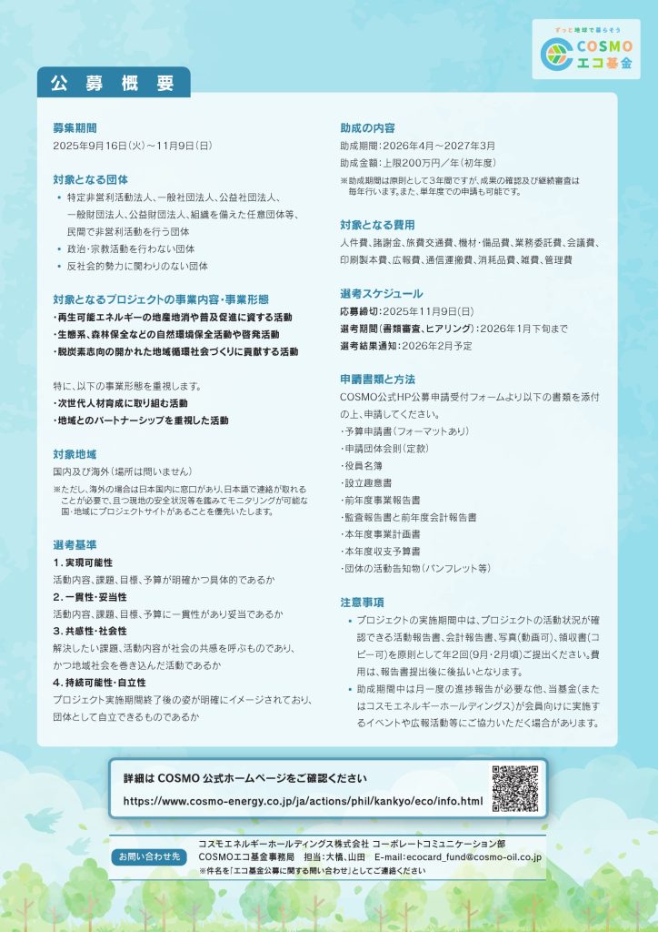 この度、COSMOエコ基金では新規プロジェクトを公募致します。