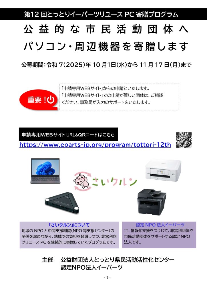 令和7年度「第12回とっとりイーパーツリユースPCプログラム(11/17締切・鳥取)