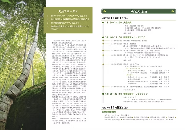 この大会は、竹に携わる生産者・加工業者など全国の関係者が一堂に会し、持続可能な竹産業の未来を切り拓くため、竹林の活用、竹製品の生産技術、竹文化の継承などの情報交換をし、交流を深めるものです。