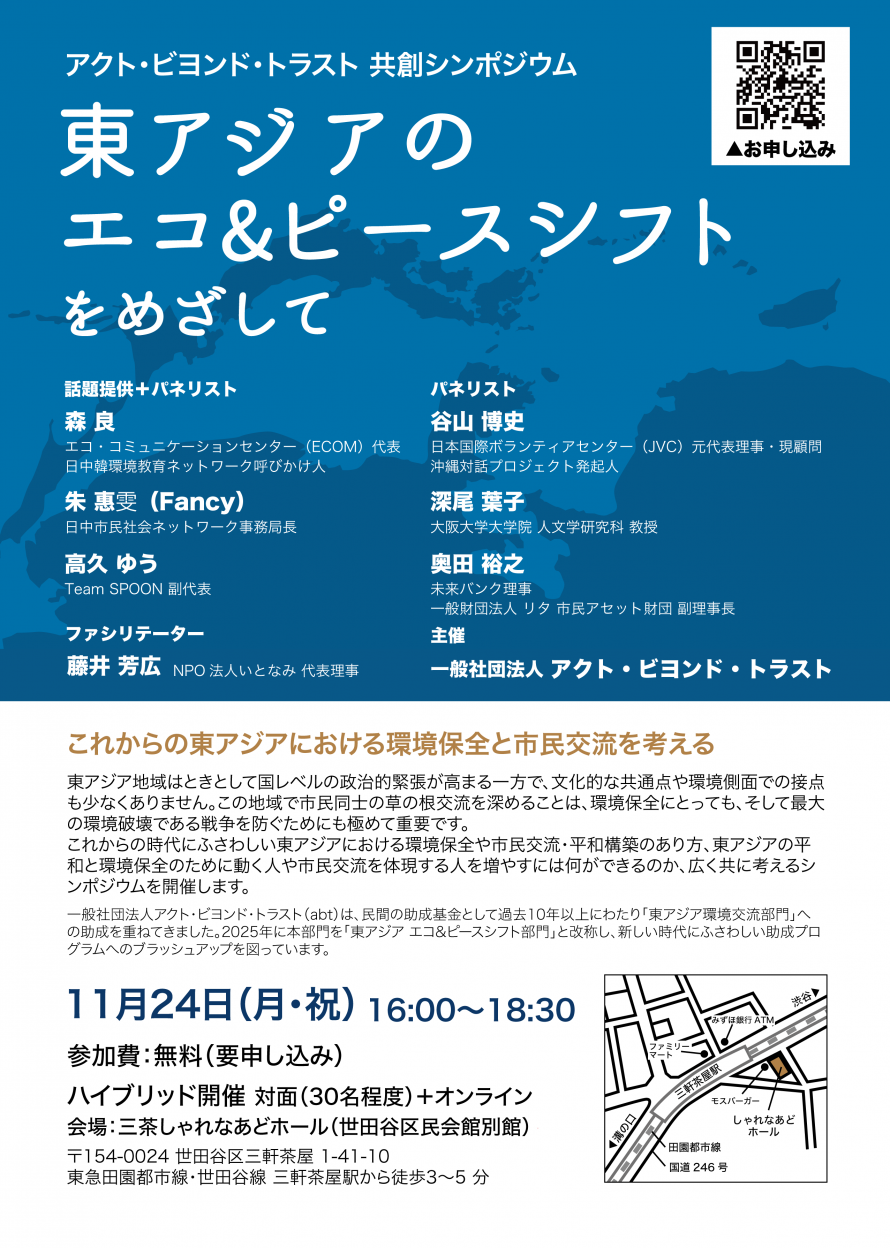 ※一般社団法人アクト・ビヨンド・トラスト(abt)は、民間の助成基金として過去10年以上にわたり「東アジア環境交流部門」への助成を重ねてきました。2025年に本部門を「東アジア エコ&ピースシフト部門」と改称し、新しい時代にふさわしい助成プログラムへのブラッシュアップを図っています。