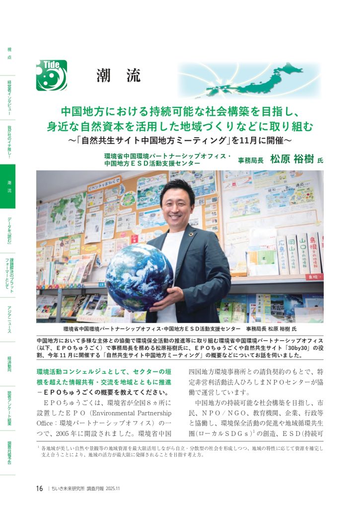 ちいき未来研究所調査月報(No.607/11月号)_に、EPOちゅうごくの取組、自然共生サイトの目的や企業の活用方法、SDGsやネイチャーポジティブの推進に向けた企業の役割、自然共生サイト中国地方ミーティング2025の開催案内等を取材掲載いただきました。