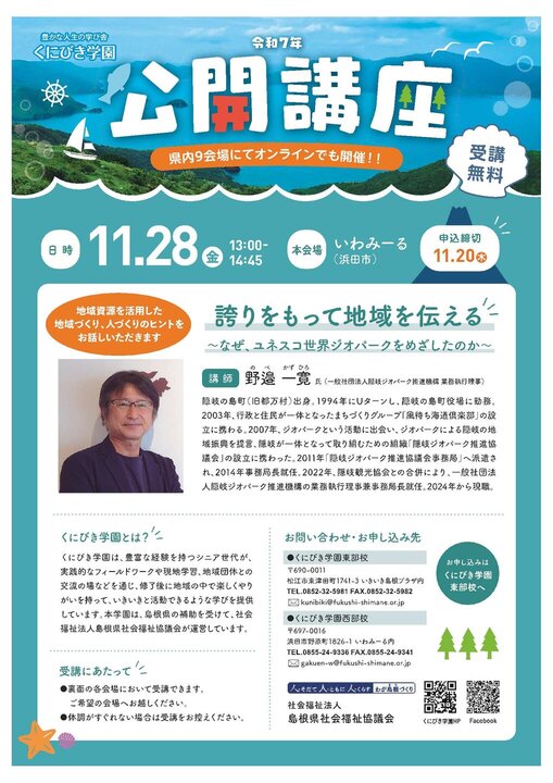 島根県社会福祉協議会では、地域課題に対する県民の関心や意識醸成を図るとともに、くにびき学園の学びを広く県民に知っていただき、学園の認知度を高めることを目的として、下記により公開講座を開催します。
