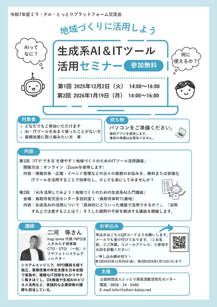 地域づくりに活用しよう⽣成系AI&ITツール活⽤セミナー第1回(12/2開催、11/18締切・鳥取オンライン)