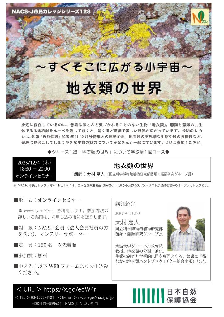 NACS-J市民カレッジ128 ~すぐそこに広がる小宇宙~ 地衣類の世界(12/4開催・オンライン)