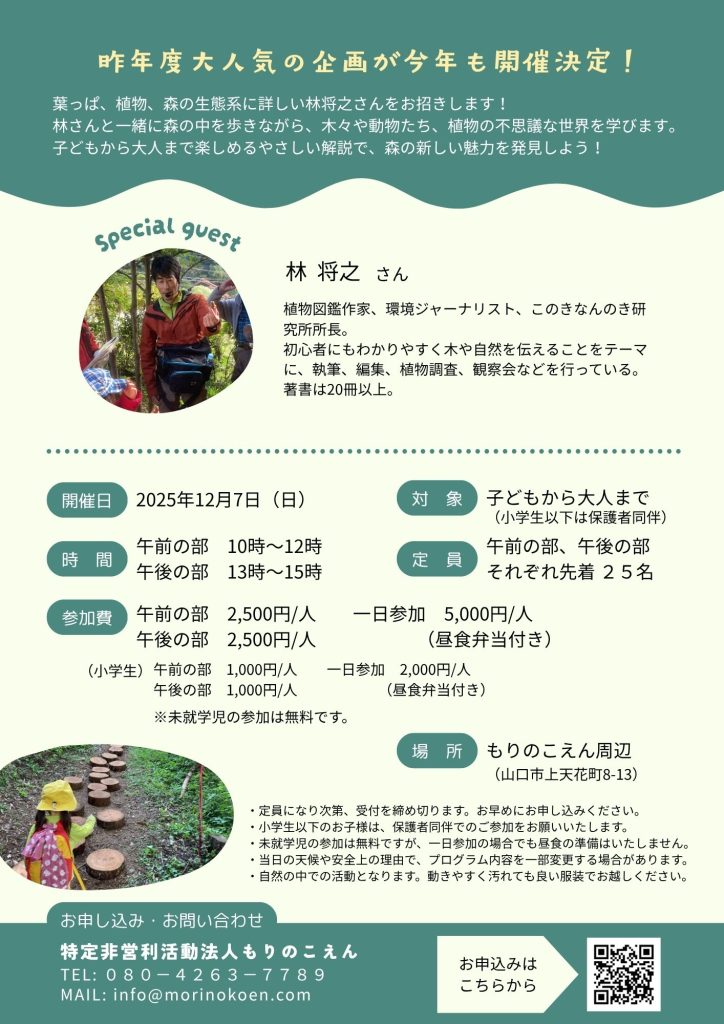 講師に、葉っぱ、植物、森の生態系に詳しい林将之さんをお招きして、自然観察会を開催します。