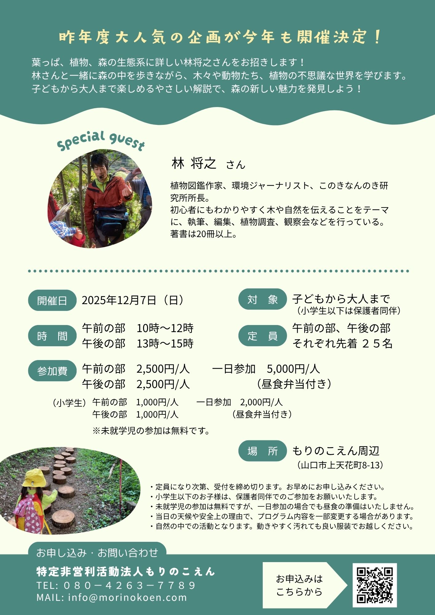講師に、葉っぱ、植物、森の生態系に詳しい林将之さんをお招きして、自然観察会を開催します。