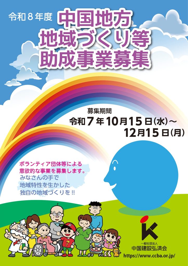 今年度も令和8年度に実施する「中国地方地域づくり等助成事業」を広く募集しますので、ご応募をいただきますようお願いいたします。