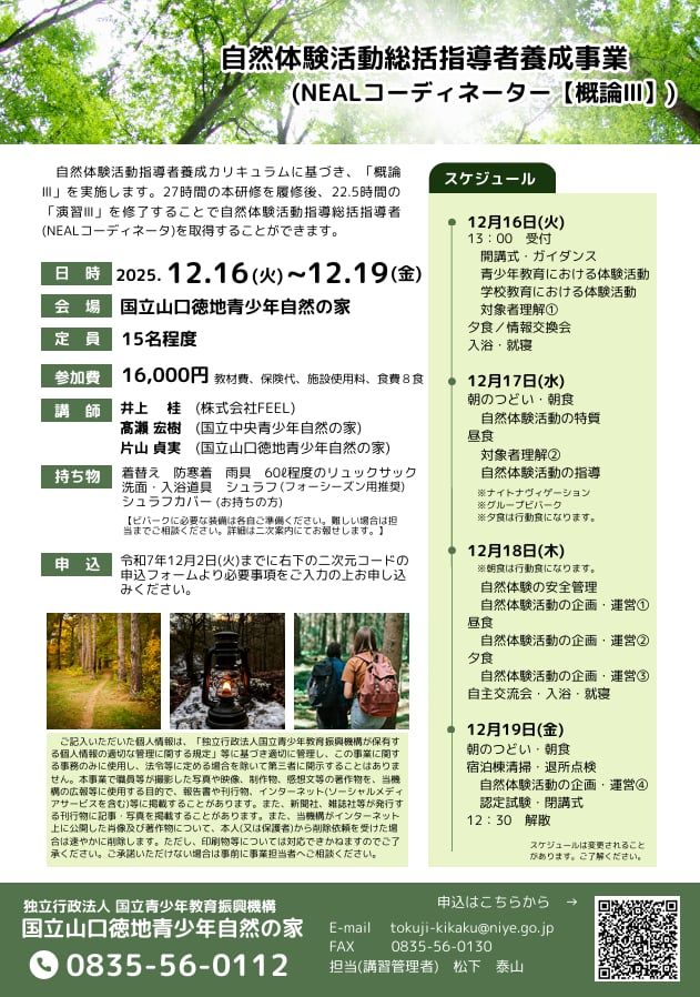 「自然体験活動総括指導者養成事業(NEALコーディネーター【概論Ⅲ】)(12/16-19開催、12/2締切・山口)