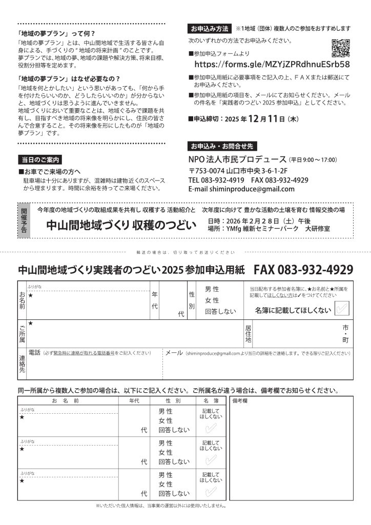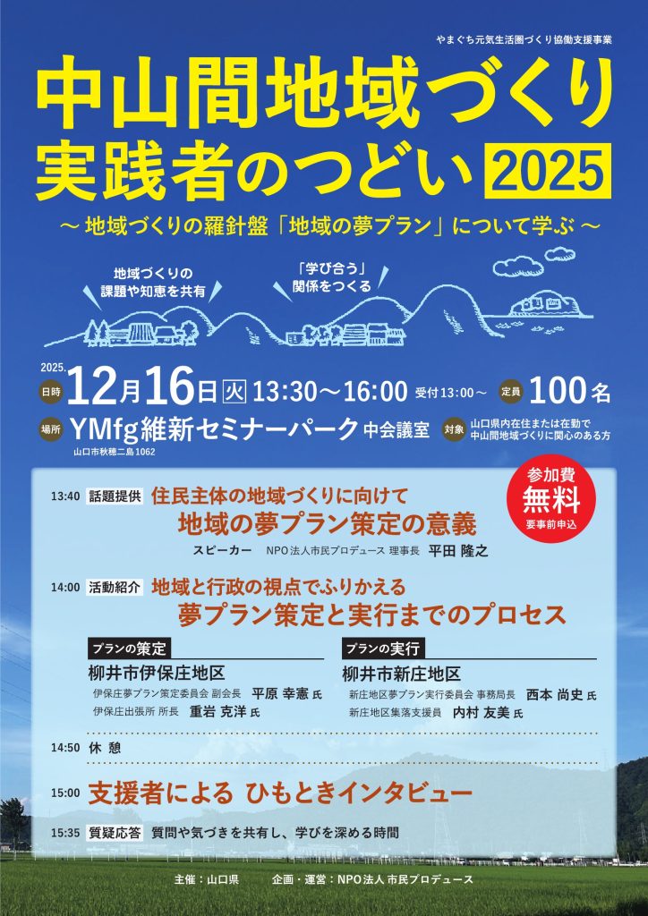 中山間地域づくり実践者のつどい2025(12/16開催、12/11締切・山口)