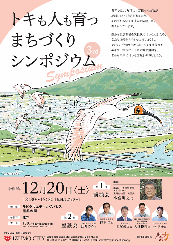 上野動物園元園長であり、出雲市トキ野生復帰アドバイザーの小宮輝之氏による講演に加え、さまざまな分野で活動する5人のパネリストによるパネルディスカッションを実施します。
