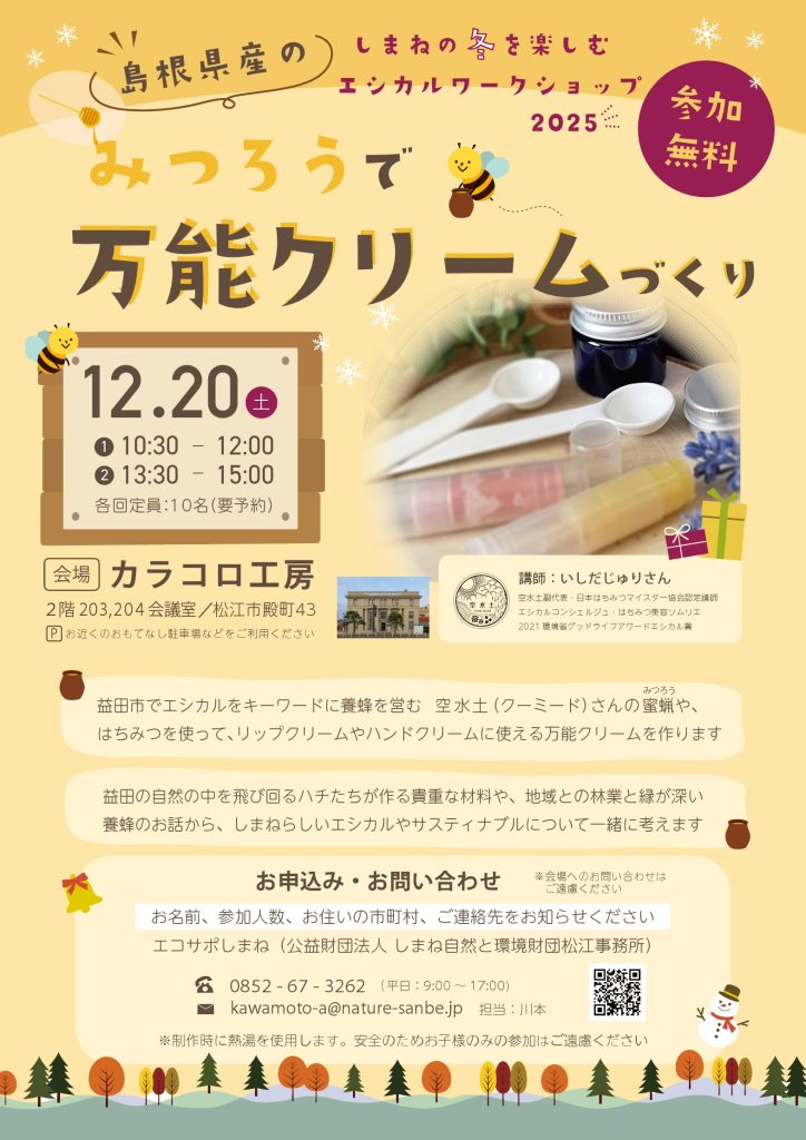 益田の自然の中を飛び回るハチたちが作る貴重な材料や、地域の林業と縁が深い養蜂のお話から、しまねらしいエシカルやサステナブルについて一緒に考え、2026年に暮らしの中で楽しむ「マイエシカル」をゲットしましょう。