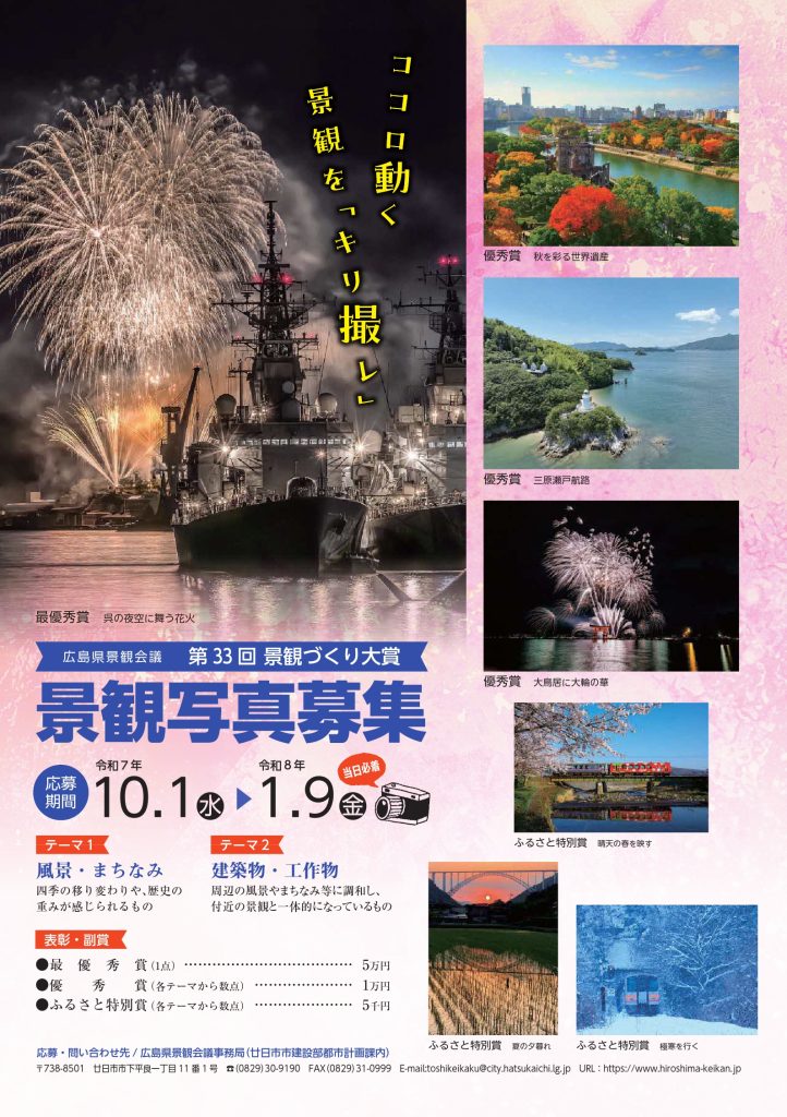 広島県景観会議では、ふるさと広島の優れた景観を広く伝え、これらの景観を保全し、 景観づくりの気運を高めることを目的として「景観づくり大賞」の作品を募集しています。