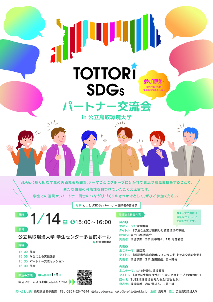 とっとりSDGsパートナー交流会 in 公立鳥取環境大学(1/14開催、1/9締切・鳥取)