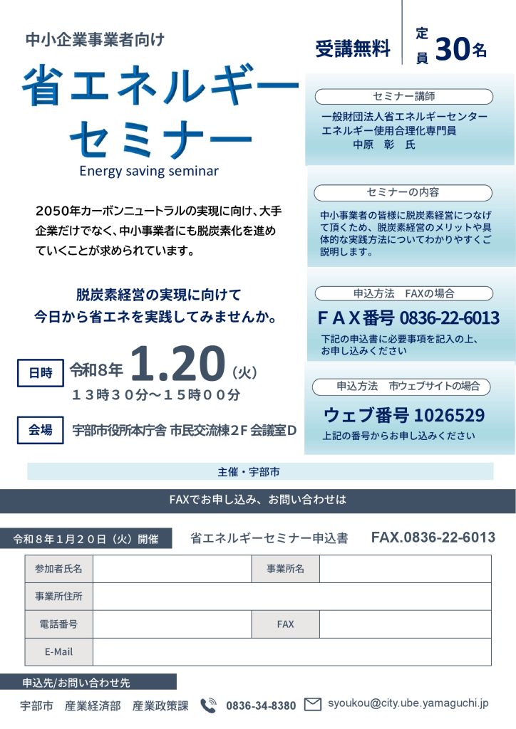 事業者向け 省エネルギーセミナー(1/20開催、1/13締切・山口)