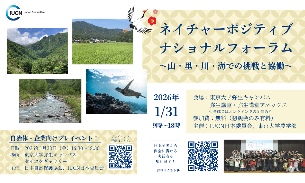 国際自然保護連合日本委員会(IUCN-J)では、これまで2020年までの世界目標「愛知目標」達成に向けて、日本各地の生物多様性保全関係者が集い、協働の輪を広げる「にじゅうまるCOP」を開催してきました。今回、その後継の場として、『ネイチャーポジティブナショナルフォーラム』を2026年1月31日(土)に、東京大学弥生キャンパスにて開催します。