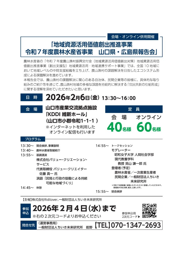 令和7年度 農林水産省事業 山口県・広島県報告会(2/6開催、2/4締切・山口+オンライン)