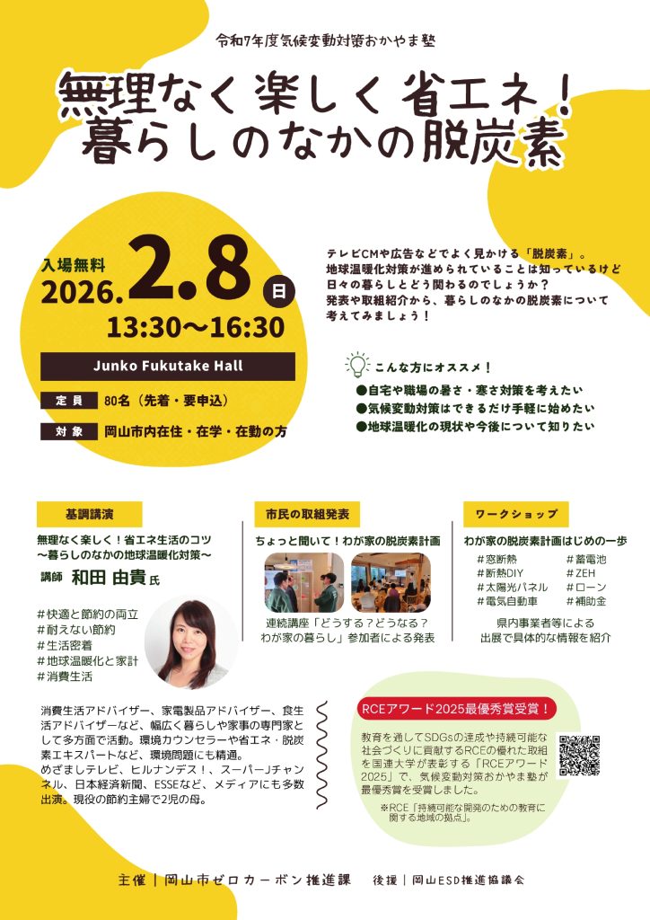 気候変動対策おかやま塾「無理なく楽しく省エネ!暮らしのなかの脱炭素」(2/8開催、2/4締切・岡山)