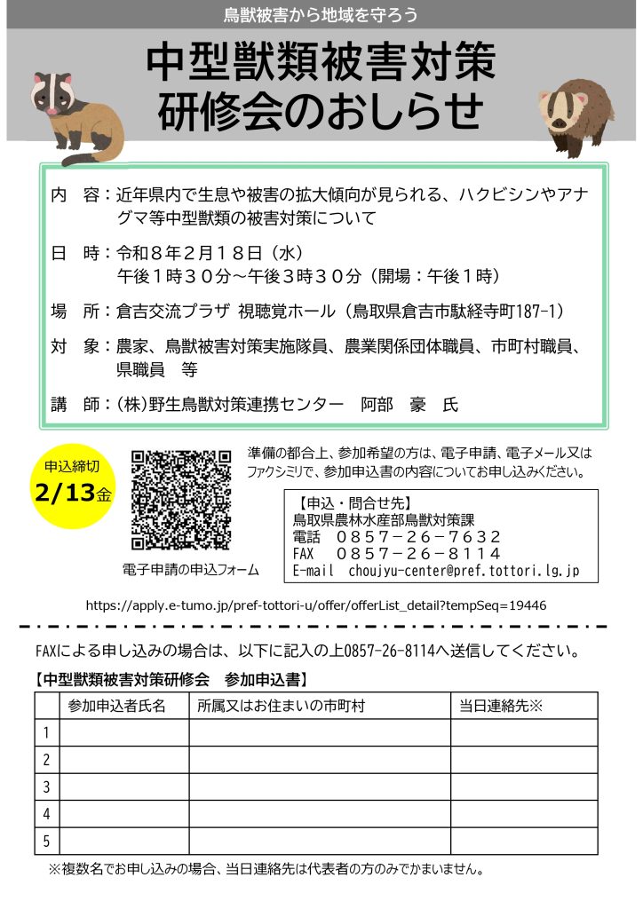 令和7年度中型獣類被害対策研修会(2/18開催、2/13締切・鳥取)