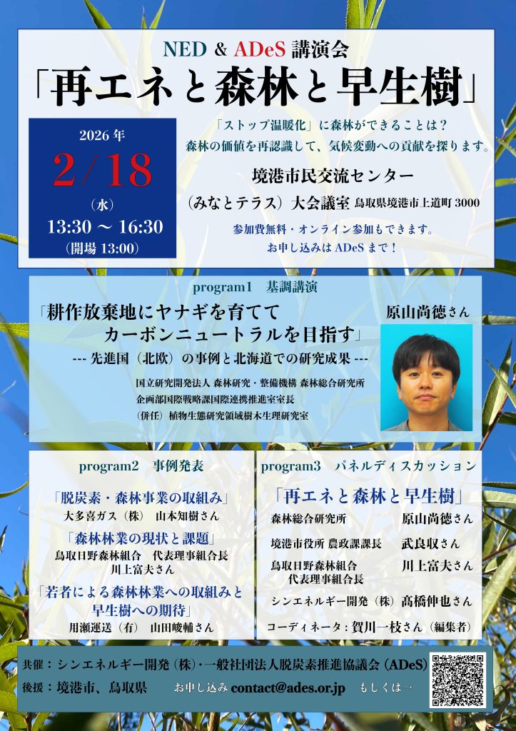 NED & ADeS講演会「再エネと森林と早生樹」(2/18開催・鳥取+オンライン)