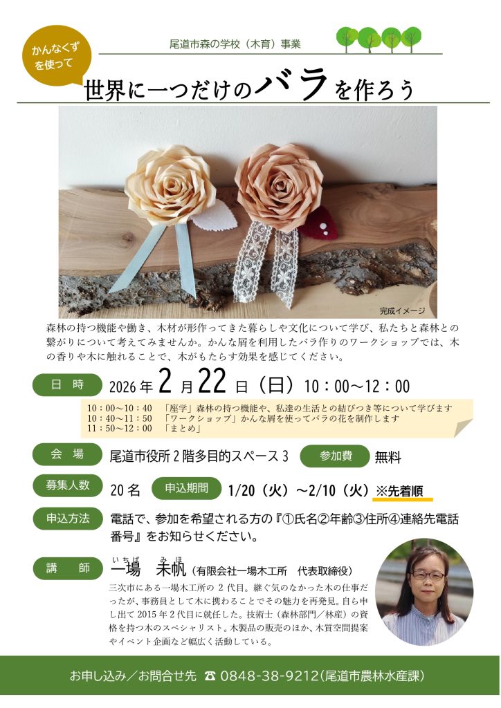 尾道市森の学校(木育)事業 かんなくずを使って「世界に一つだけのバラを作ろう」(2/22開催、2/10締切・広島)