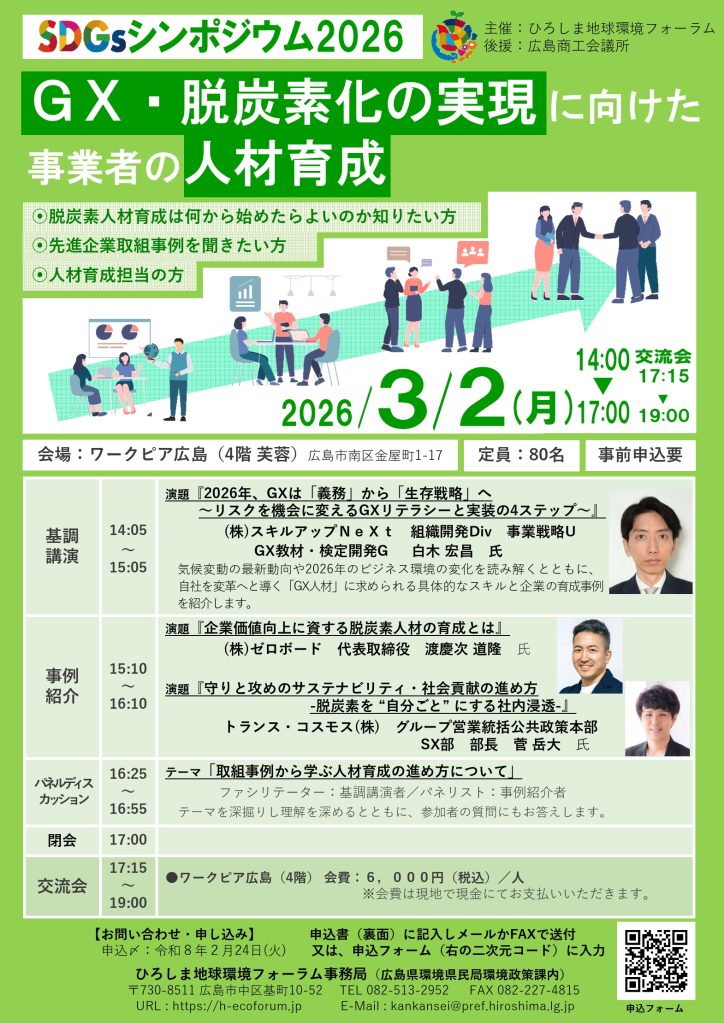 ひろしま地球環境フォーラムでは、「GX・脱炭素化の実現に向けた事業者の人材育成」をテーマにシンポジウムを開催します。