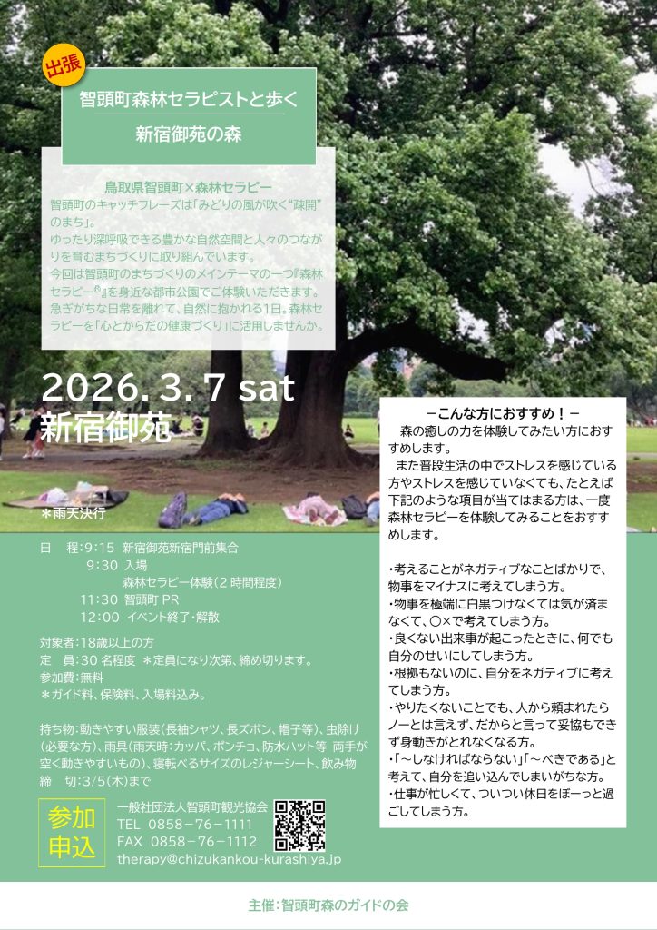 智頭町森林セラピストと歩く「新宿御苑」の森(3/7開催・鳥取)