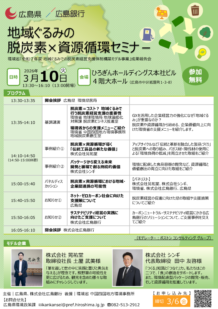 地域ぐるみの脱炭素×資源循環セミナ-(3/10開催、3/6締切・広島)