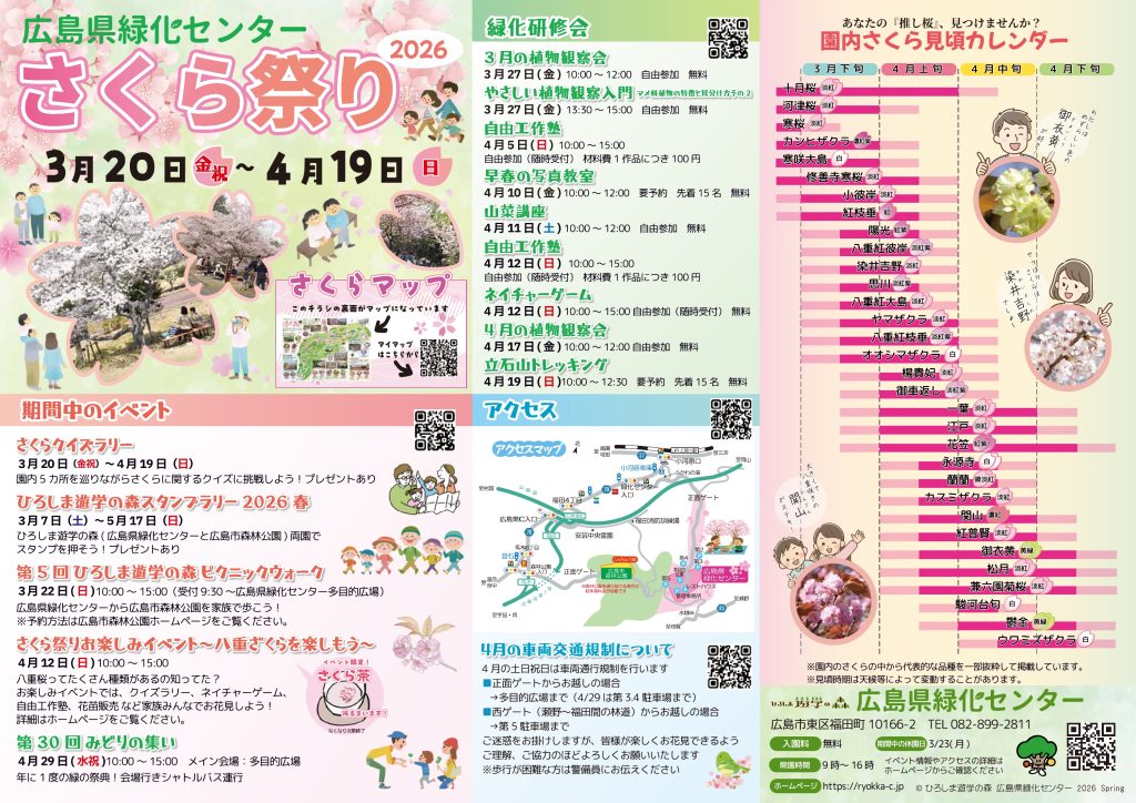 広島県緑化センター さくら祭り2026(3/20-4/19開催・広島)