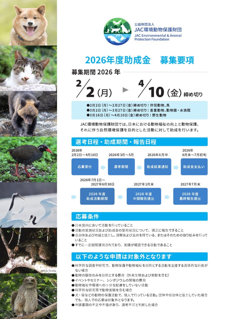 JAC環境動物保護財団【野生動物】 2026年度助成金(4/10締切・全国)