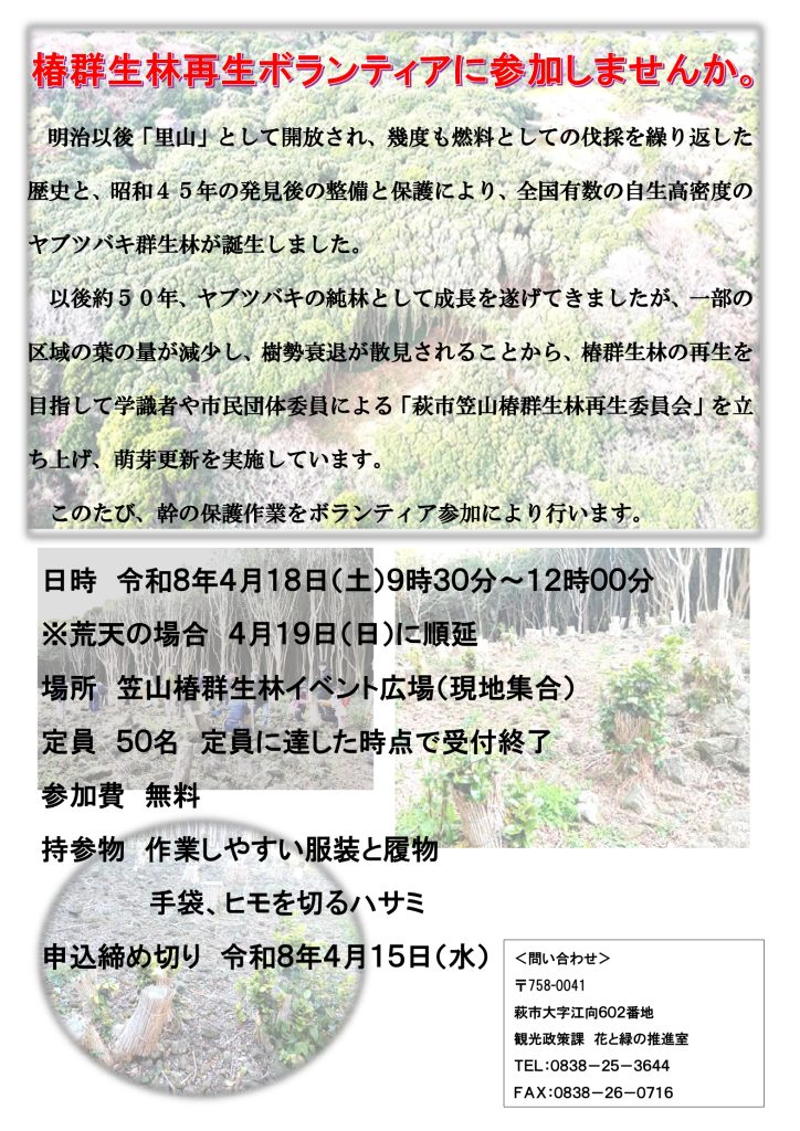 「笠山椿群生林再生」のボランティア参加者募集(4/18開催、4/15締切・山口)