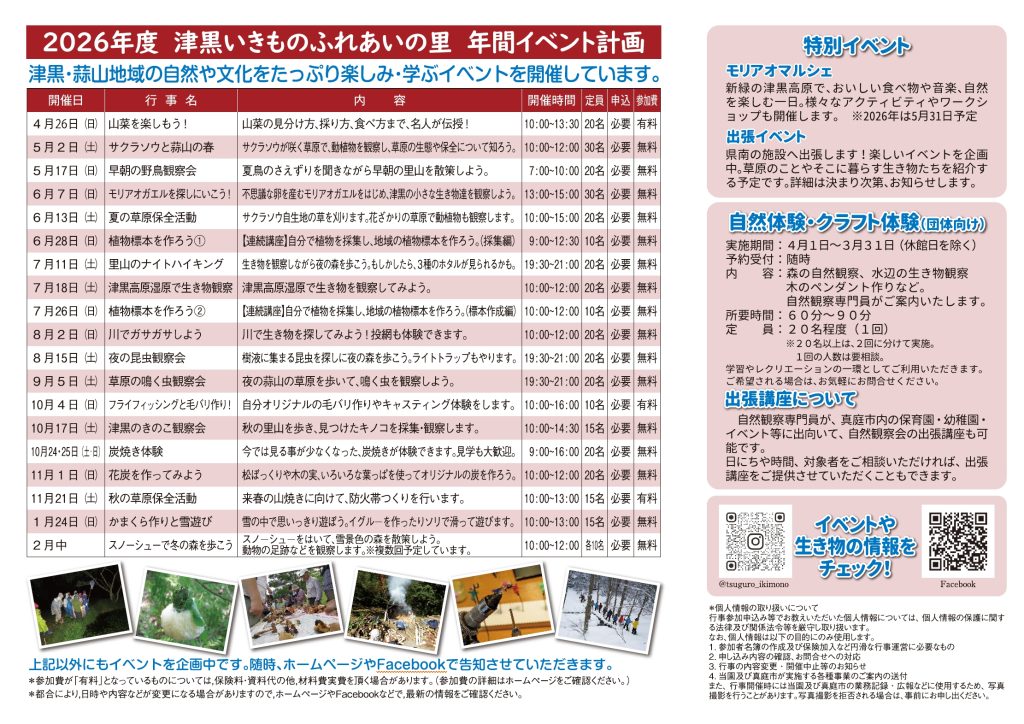 津黒いきものふれあいの里では、季節に応じて様々な自然観察・自然体験のイベントを行っております。自然を楽しむ第一歩として、是非参加してみて下さい。