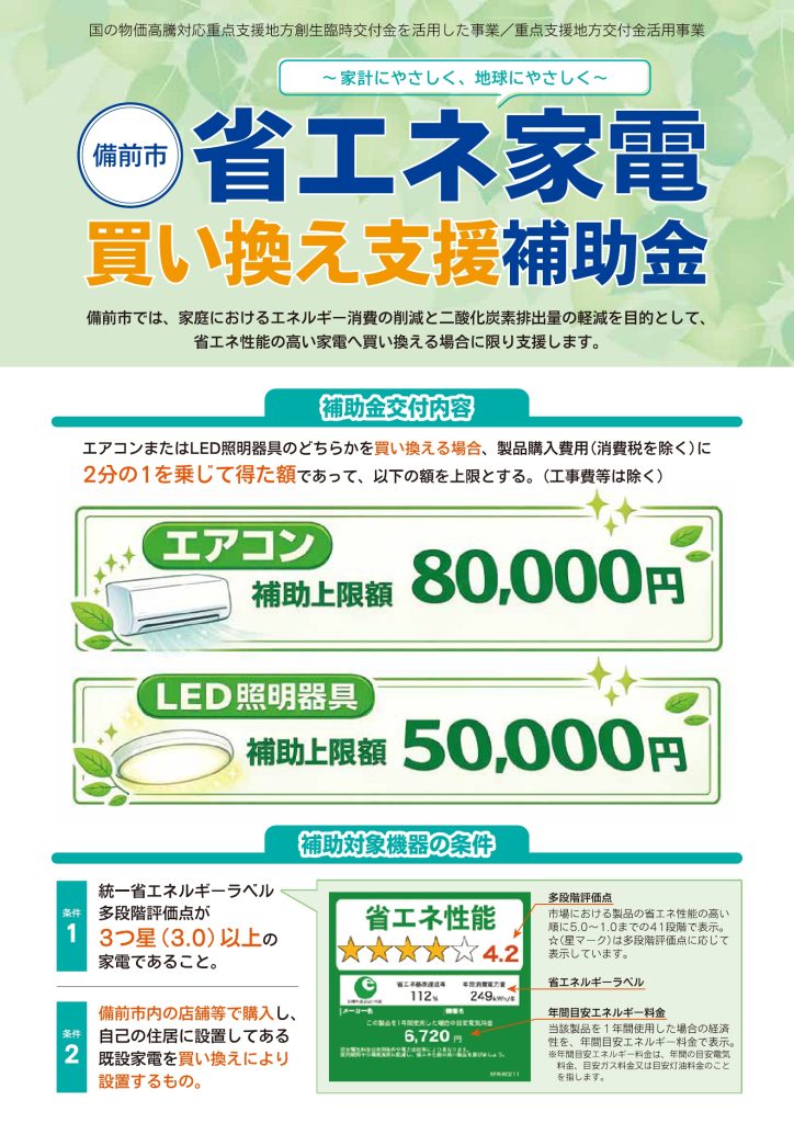 ~家計にやさしく、地球にやさしく~ 備前市省エネ家電買い換え支援補助金