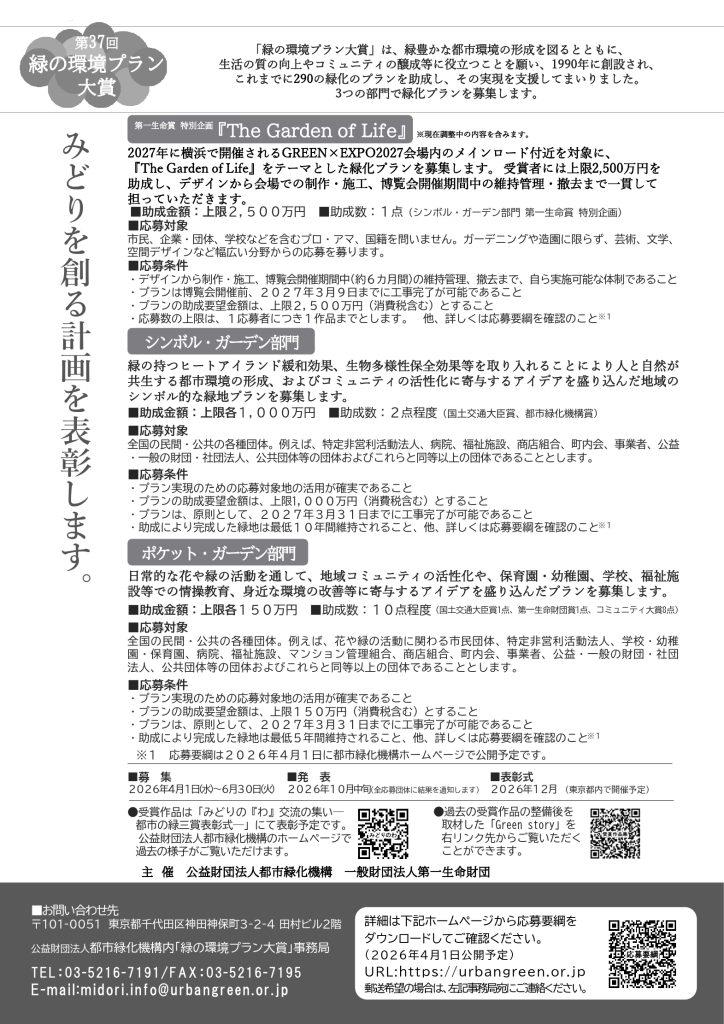 なお、2026年度のシンボル・ガーデン部門 第一生命賞1点については、2027年国際園芸博覧会会場を対象とし、2500万円を上限に助成する特別企画『The Garden of Life』を実施します。