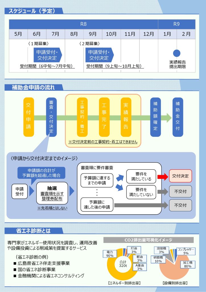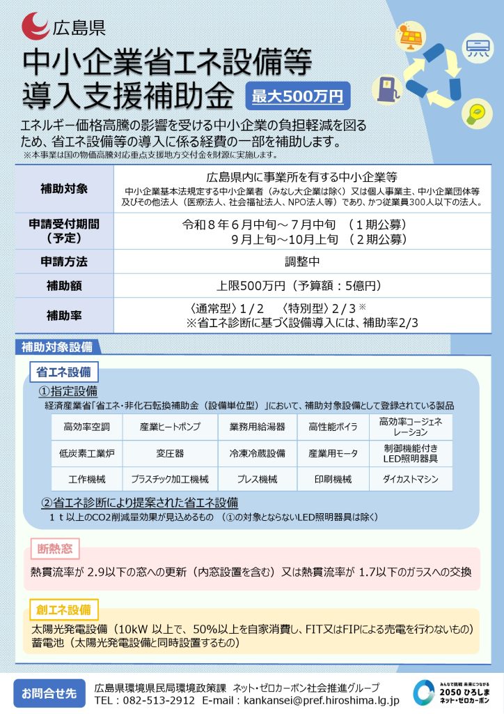 エネルギー価格高騰の影響を受ける中小企業の負担軽減を図るため、省エネ設備等の導入に係る経費の一部を補助します。