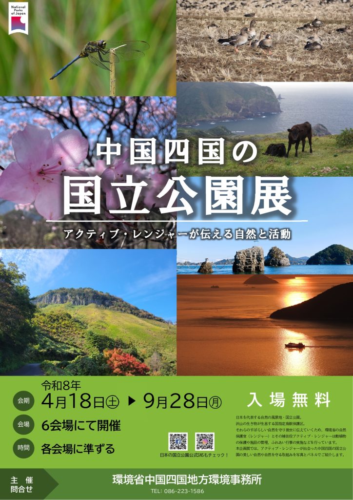 中国四国地方には3つの国立公園(大山隠岐・瀬戸内海・足摺宇和海)が指定され、11人のアクティブ・レンジャー(自然保護官補佐)が活動しています。アクティブ・レンジャーが日々の活動で出合った素晴らしい自然や風景、自然保全活動に取り組む人々を紹介する巡回企画展を開催します。