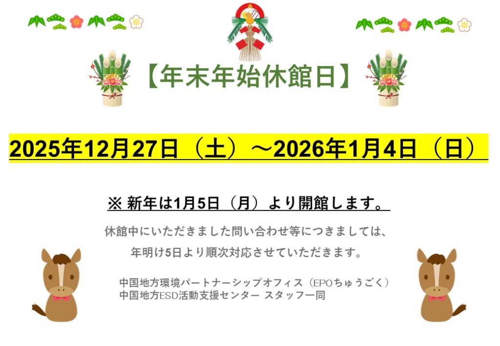 【休館のお知らせ】12月27日(土)~1月4日(月)は年末年始の為休館いたします。 お知らせ 2025 . 12 . 26 開催日・期間 ー 開催時間 ー 申込期限 ー 実施主体 EPOちゅうごく 平素は、格別のご愛顧を賜り御礼申しあげます。 誠に勝手ながら、下記の期間を『年末年始休館』いたします。 何卒ご理解賜りますよう、よろしくお願い申しあげます。 EPOちゅうごく 中国地方ESD活動支援センター スタッフ一同 この記事に関するお問合せ・申込 お問い合わせ先 EPOちゅうごく・中国地方ESD活動支援センター 電話番号 082-511-0720 公式サイト