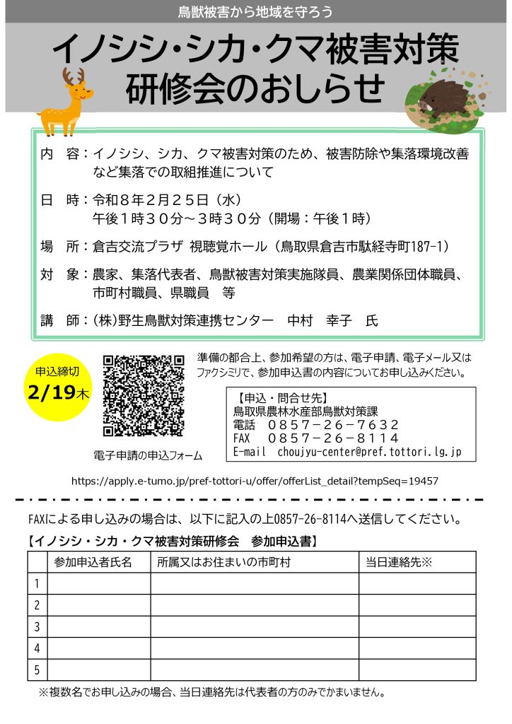 令和7年度イノシシ・シカ・クマ被害対策研修会(2/25開催、2/19締切・鳥取)