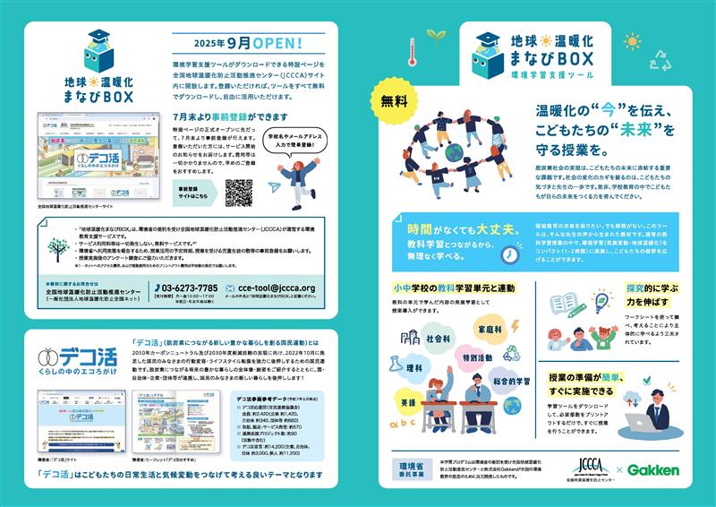 JCCCA(全国地球温暖化防止活動推進センター)では、気候変動教育の導入促進に向けて、Gakkenと共同で「地球温暖化まなびBOX」を開発しました。