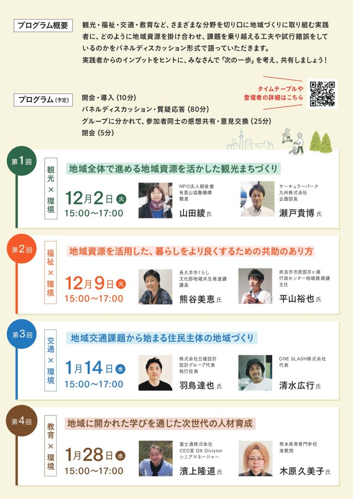 | 第2回 | 12/9(火) | 福祉×環境 | 地域資源を活用した、暮らしをより良くするための共助のあり方 |