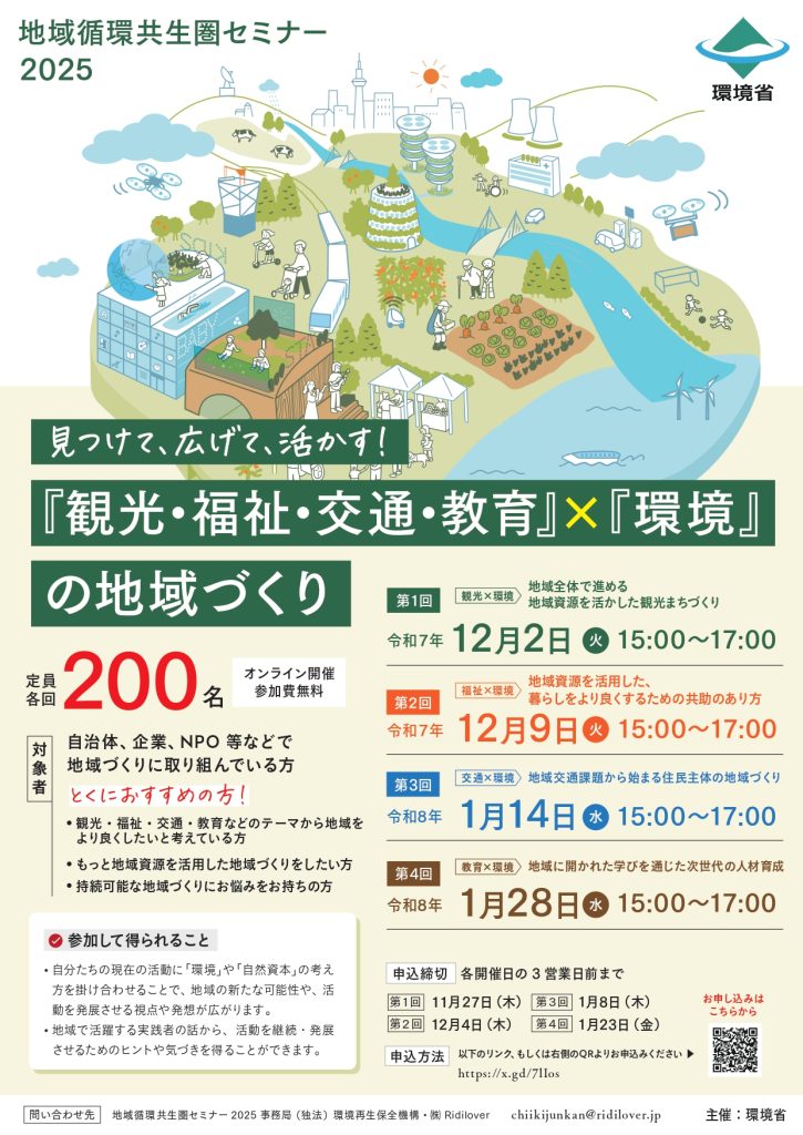 地域循環共生圏セミナー2025「見つけて、広げて、活かす!『観光・福祉・交通・教育』×『環境』の地域づくり」の開催について(12/2,12/9,1/14,1/28開催・全国)