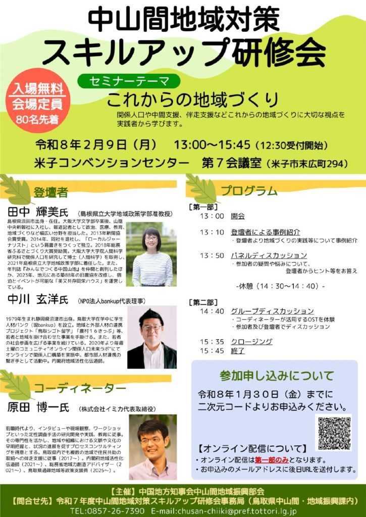 中山間地域対策スキルアップ研修会(2/9開催、1/30締切・鳥取+オンライン)