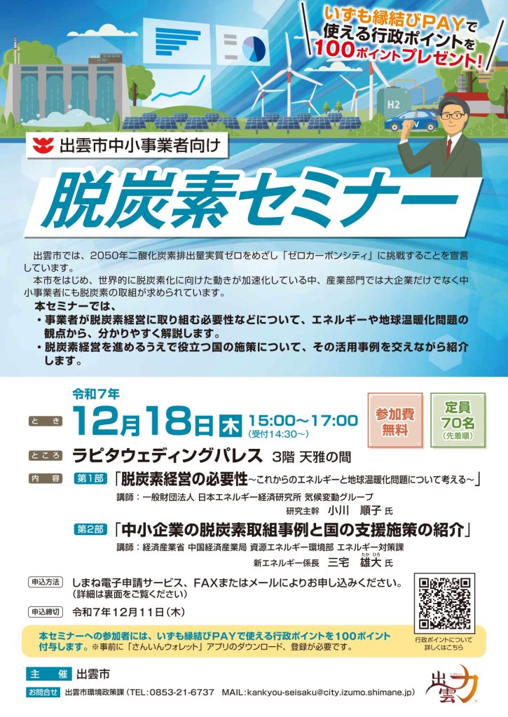 中小事業者向け脱炭素セミナー(12/18開催、12/11締切・島根)