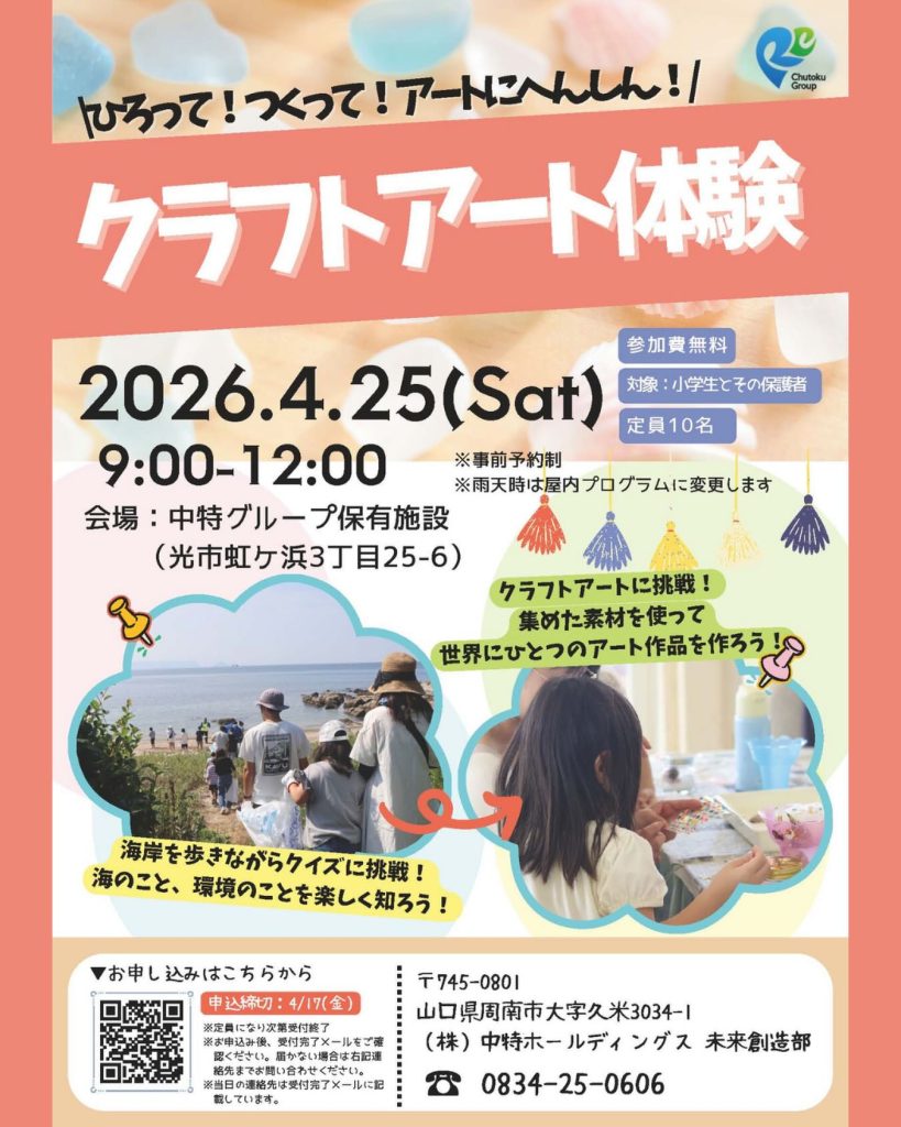 【体験の機会の場認定プログラム】ひろって!つくって!アートにへんしん!クラフトアート体験 参加者募集(4/25開催、4/17締切・山口)